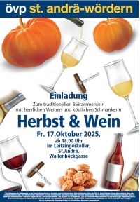 Die ÖVP St. Andrä-Wördern lädt traditionell im Oktober zu ihrem Herbst und Wein in den privaten Leitzinger Keller, der eigens dafür geöffnet und geschmückt wird. Jede, jeder ist willkommen. Freut Euch mit uns über einen gemütlichen Abend und nette Gespräche.