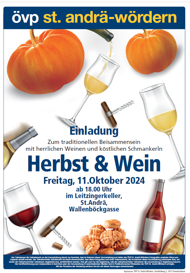 Das traditionelle Herbst und Wein am 17. Oktober nutzen erfreulich viele zum Gedankenaustausch und um ein gutes Glaserl Wein zu trinken. Ehrengäste waren NRAbg. Johann Höfinger und VP-Bezirks-Geschäftsführerin Paula Maringer. Siehe Fotos.