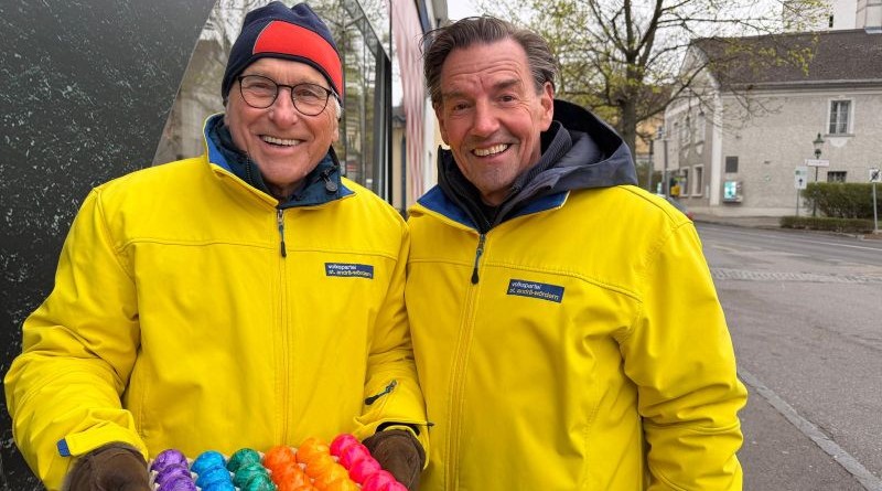 Bunte Farbtupfer und ein Lächeln in viele Gesichter brachte das Team der ÖVP StAW in den kalten, düsteren Graupelschauer-Samstag. Vor den Adeg- Fillialen, beim Wiesbauer überreichten die Wetterfesten schön gefärbte Ostereier in den verschiedensten Farben.